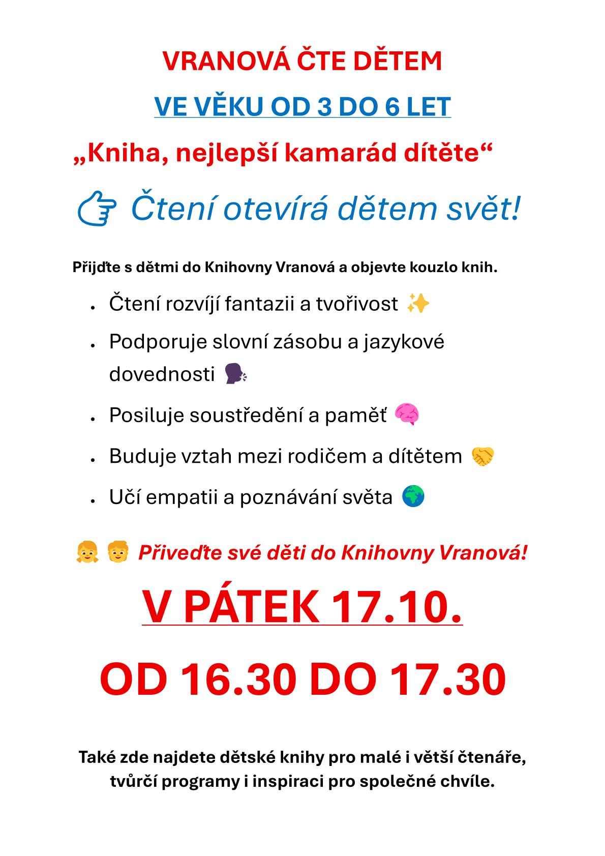 Vranová čte dětem 15.10.2025 Vystavil: Rostislav Cichra Sdílet Sdílet Klikněte pro zkopírování URL Facebook Přijďte s dětmi do knihovny...